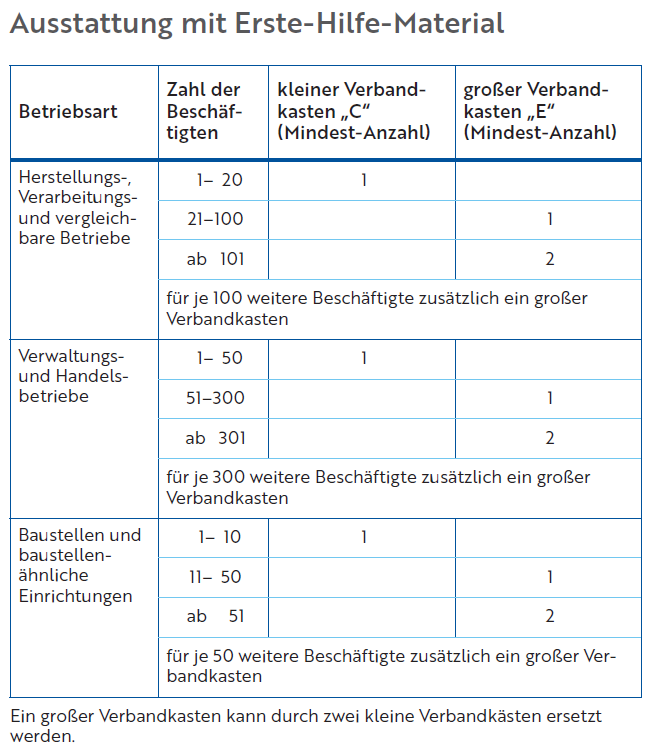 Zum Erste-Hilfe-Material zählen besonders die Verbandstoffe. In jeden Betrieb gehören Verbandkästen, deren Anzahl sich nach der Betriebsart und -größe richtet. Man unterscheidet: