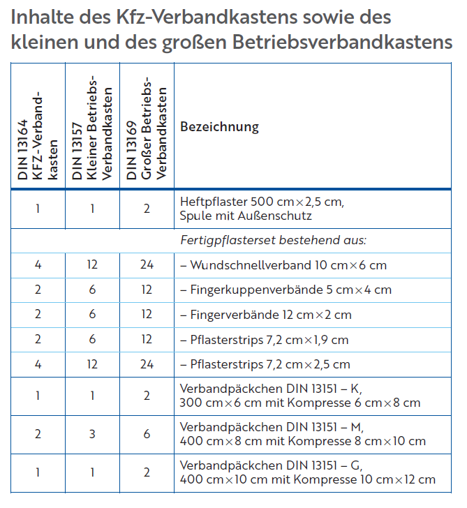DIN 13157, DIN 13169 und DIN 13164 schreiben vor, wie Verbandkästen in Betrieben und KFZ-Verbandkästen bestückt sein müssen. Was gehört hinein?