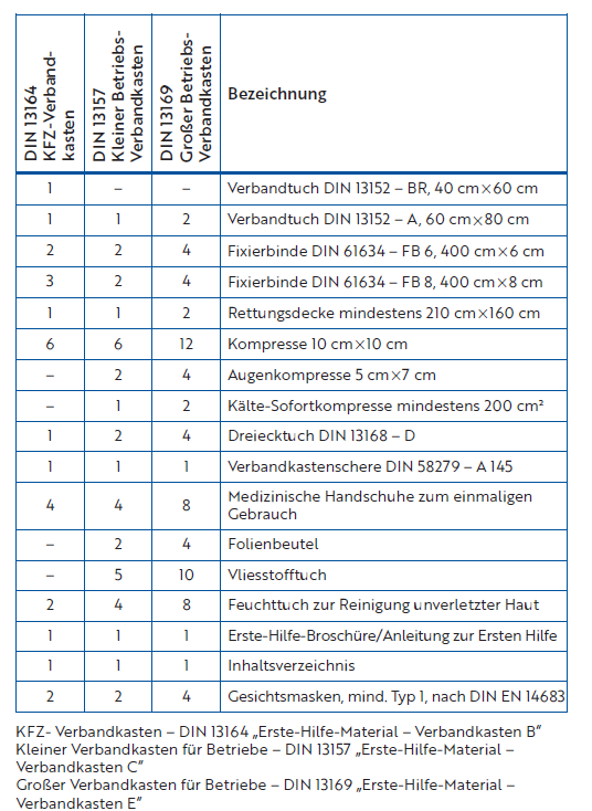 Die Verbandkästen für Betriebe unterscheiden sich in ihrem Inhalt von den Kfz-Verbandkästen. Die Inhalte der Verbandkästen nach Norm gibt die nachfolgende Liste wieder.