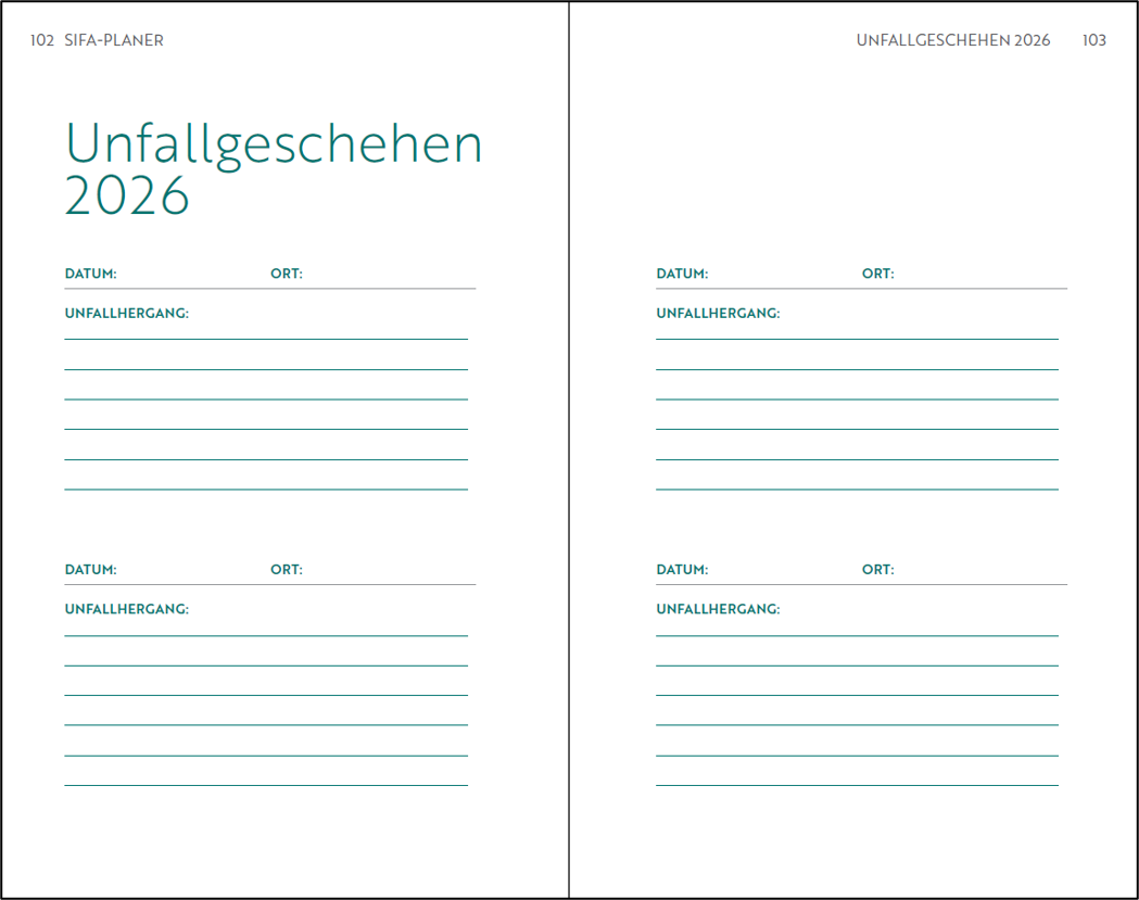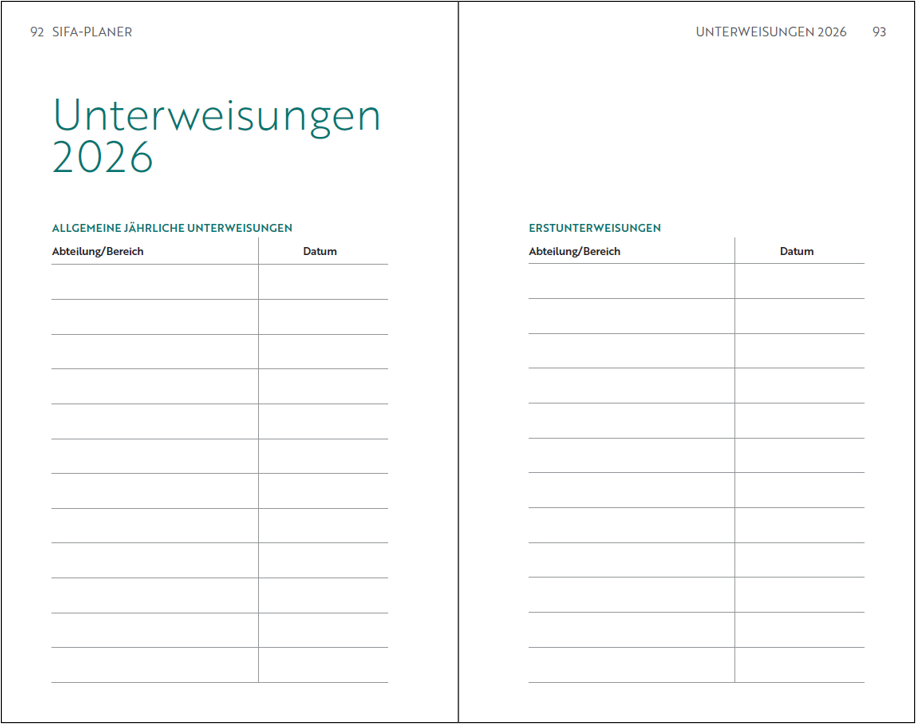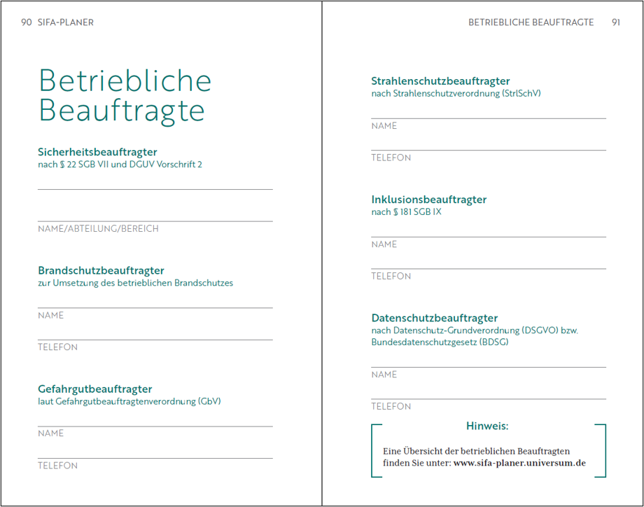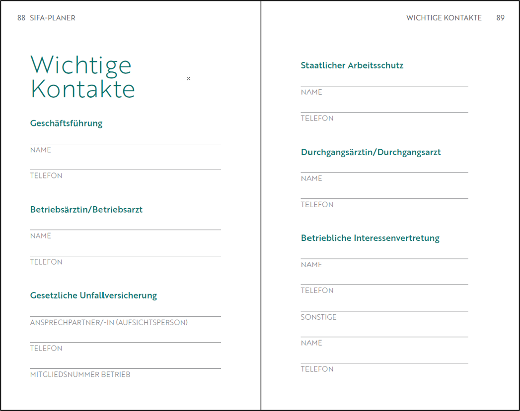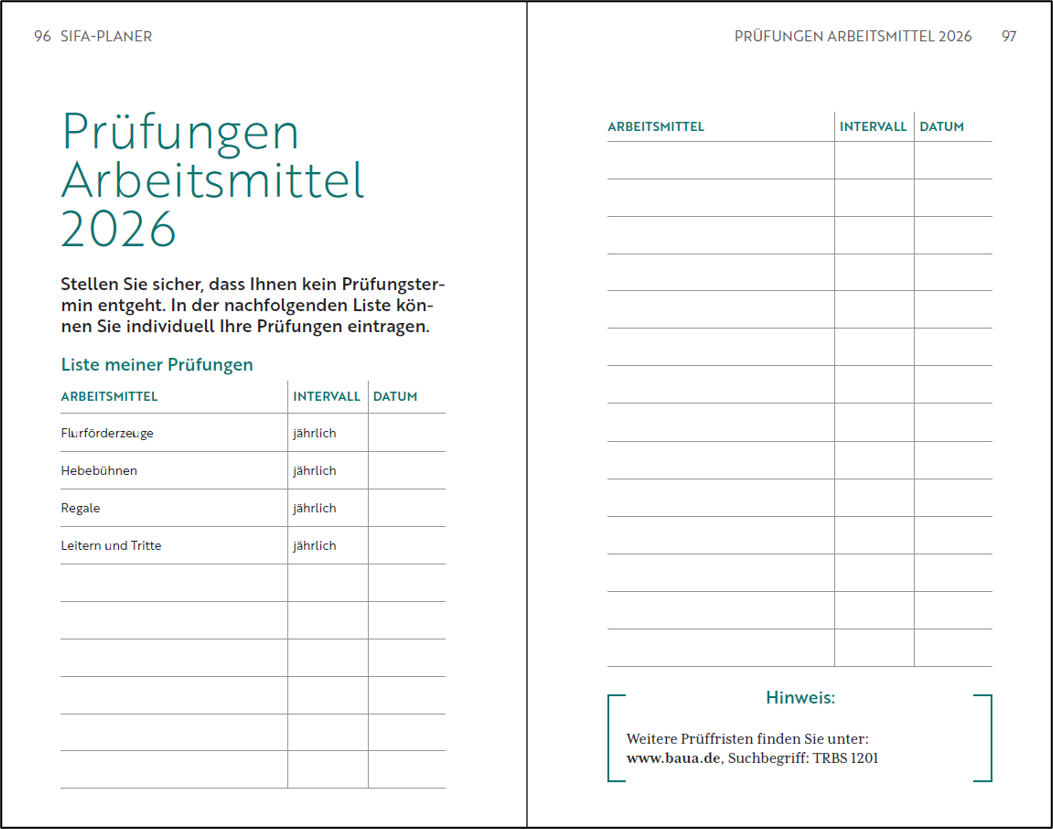 Wichtige Kontakte, betriebliche Beauftragte, Termine für Arbeitsmittelprüfungen oder Weiterbildungen – notieren Sie Ihre Termine im SIFA-PLANER und behalten Sie so alles, was wichtig ist, im Blick!